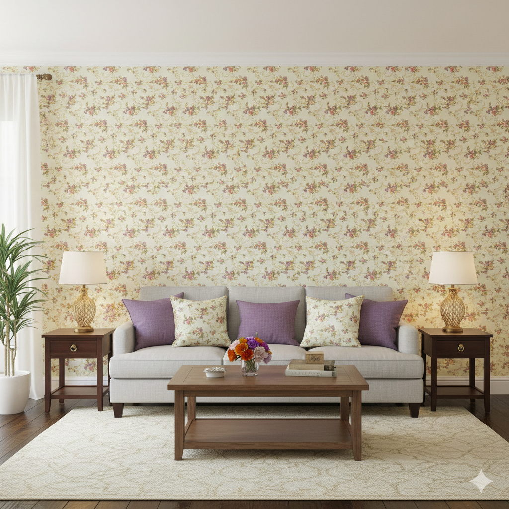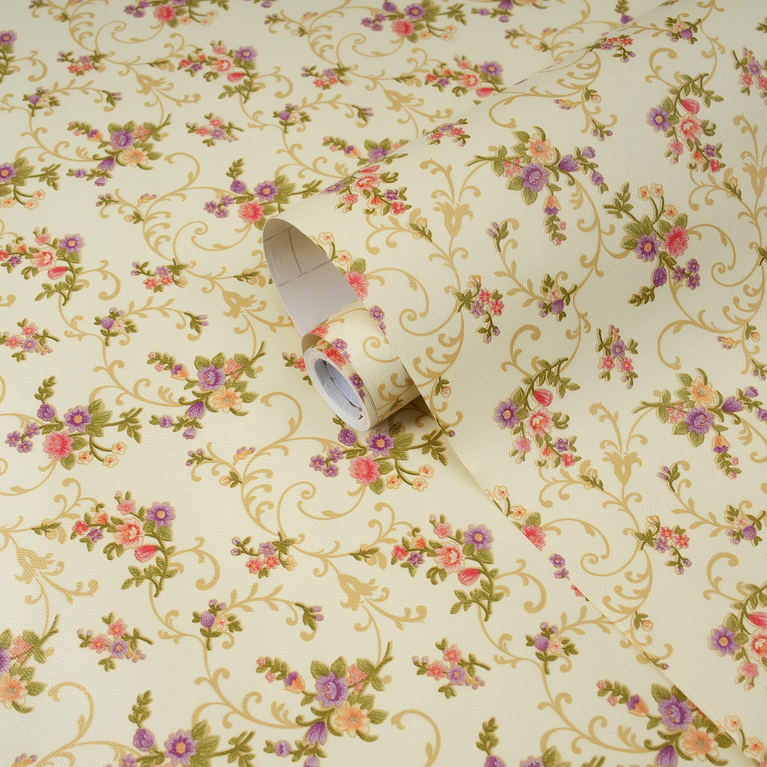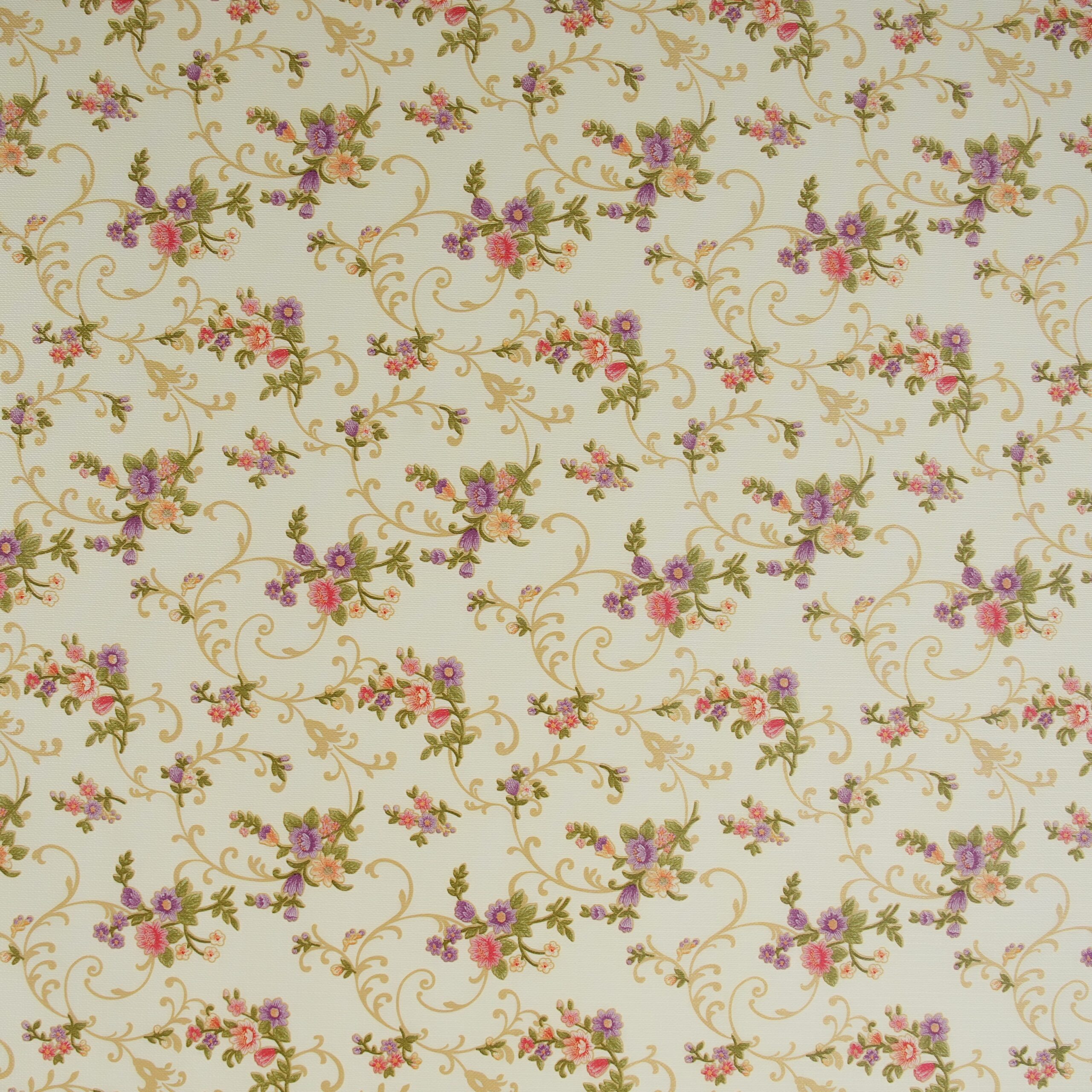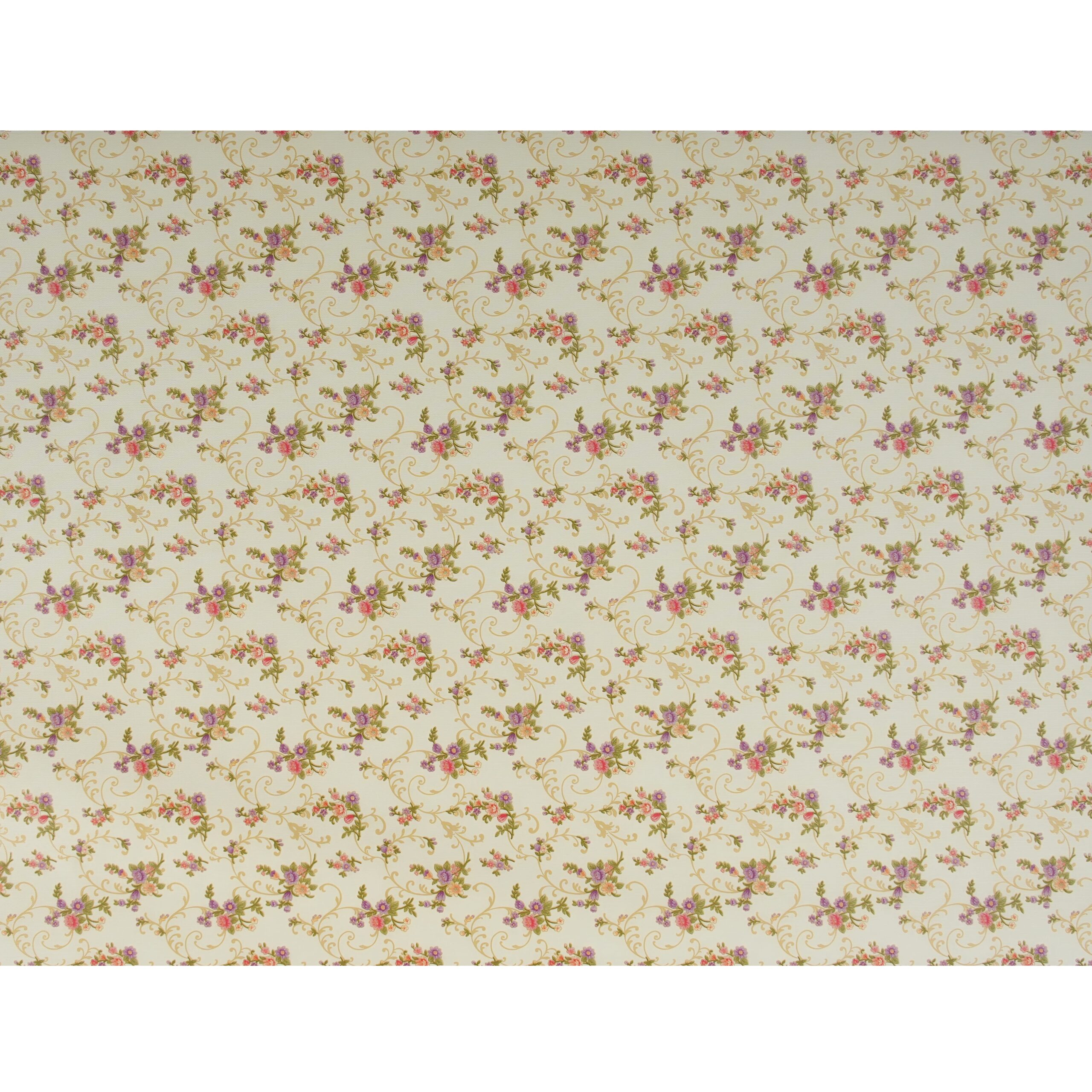 The design features small bouquets of pink, purple, and peach flowers with green leaves, connected by flowing gold vine and scroll motifs on light cream background expressing vintage look.