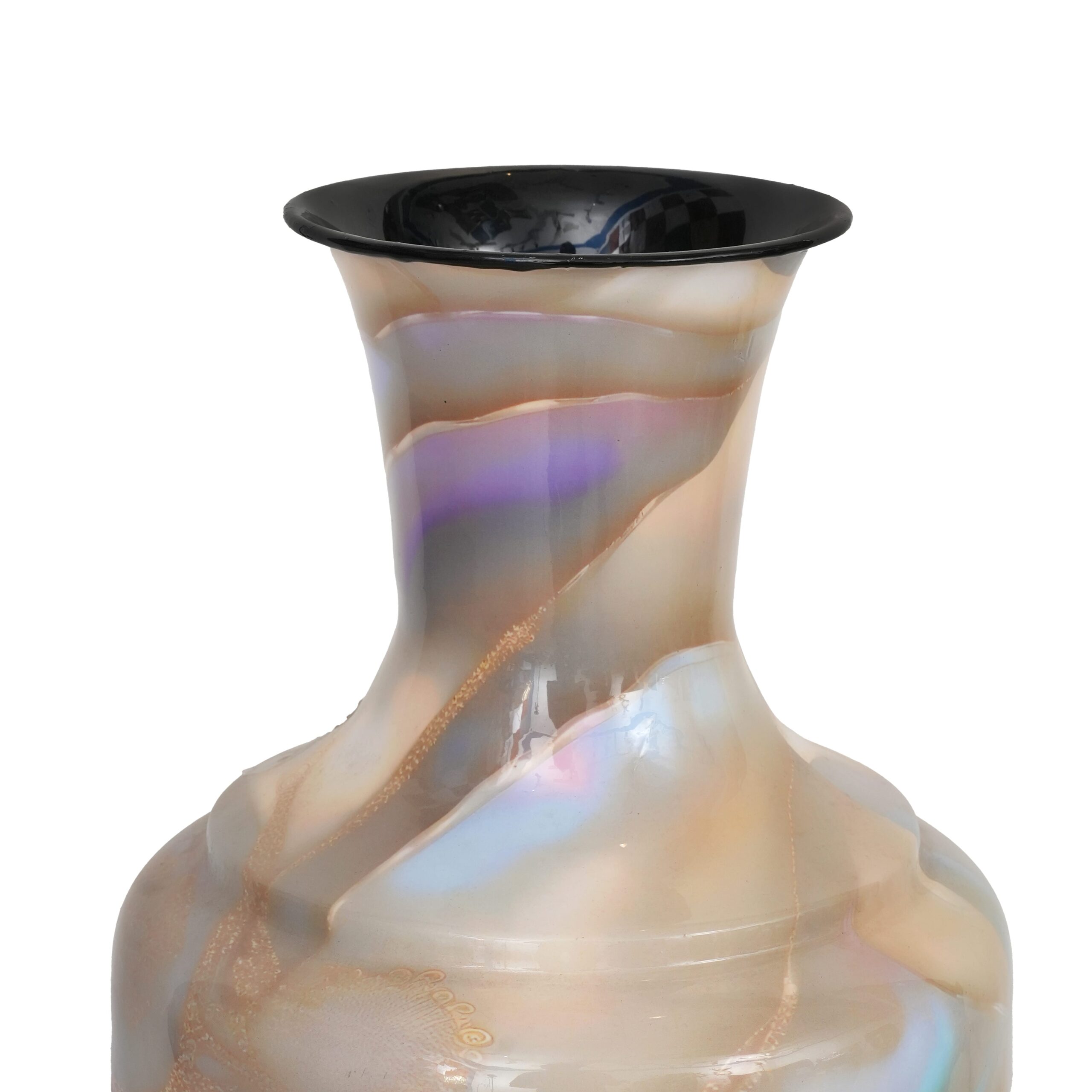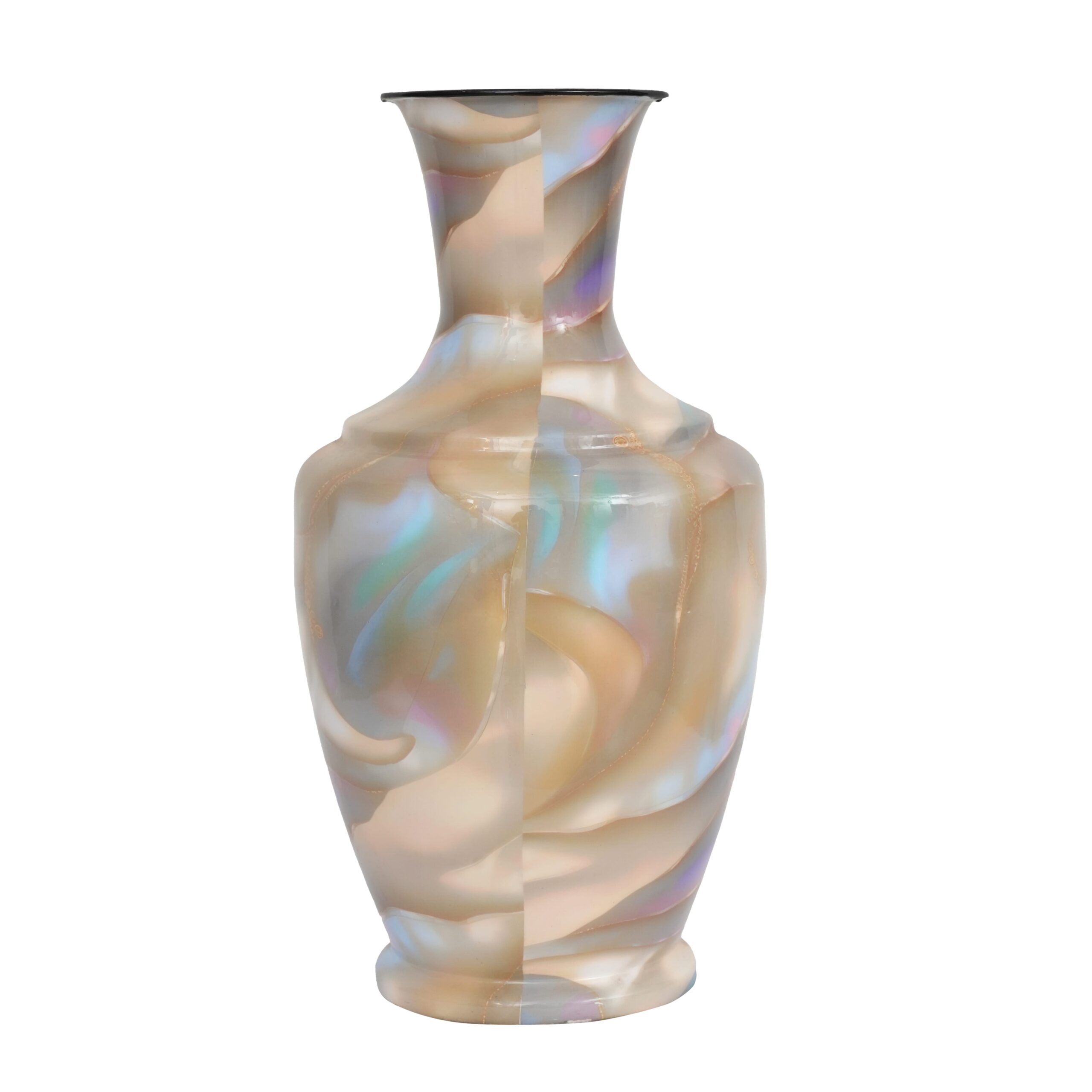 A decorative vase with a balanced, classic silhouette, featuring a rounded body, gently defined shoulders, and a tall, slightly flared neck. The surface is finished in a soft, pearlescent marble-effect glaze with flowing, cloud-like patterns in warm ivory, beige, and champagne tones, subtly infused with iridescent hints of pastel blue, lavender, and blush.