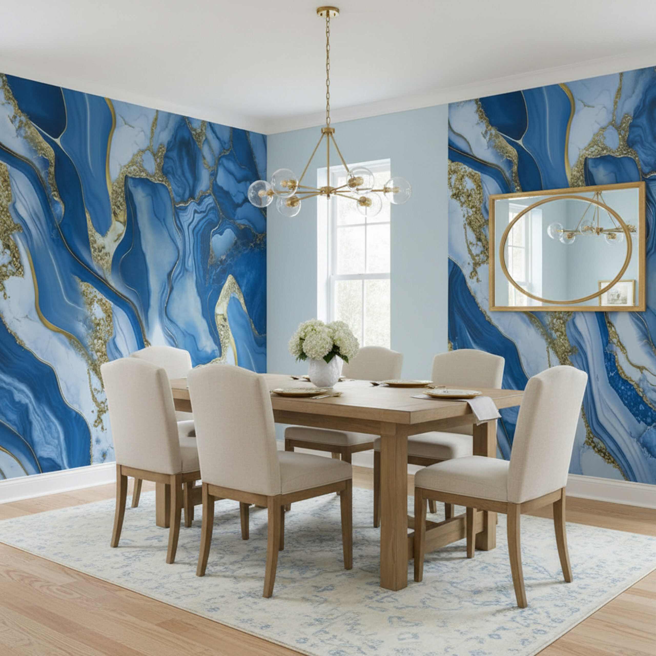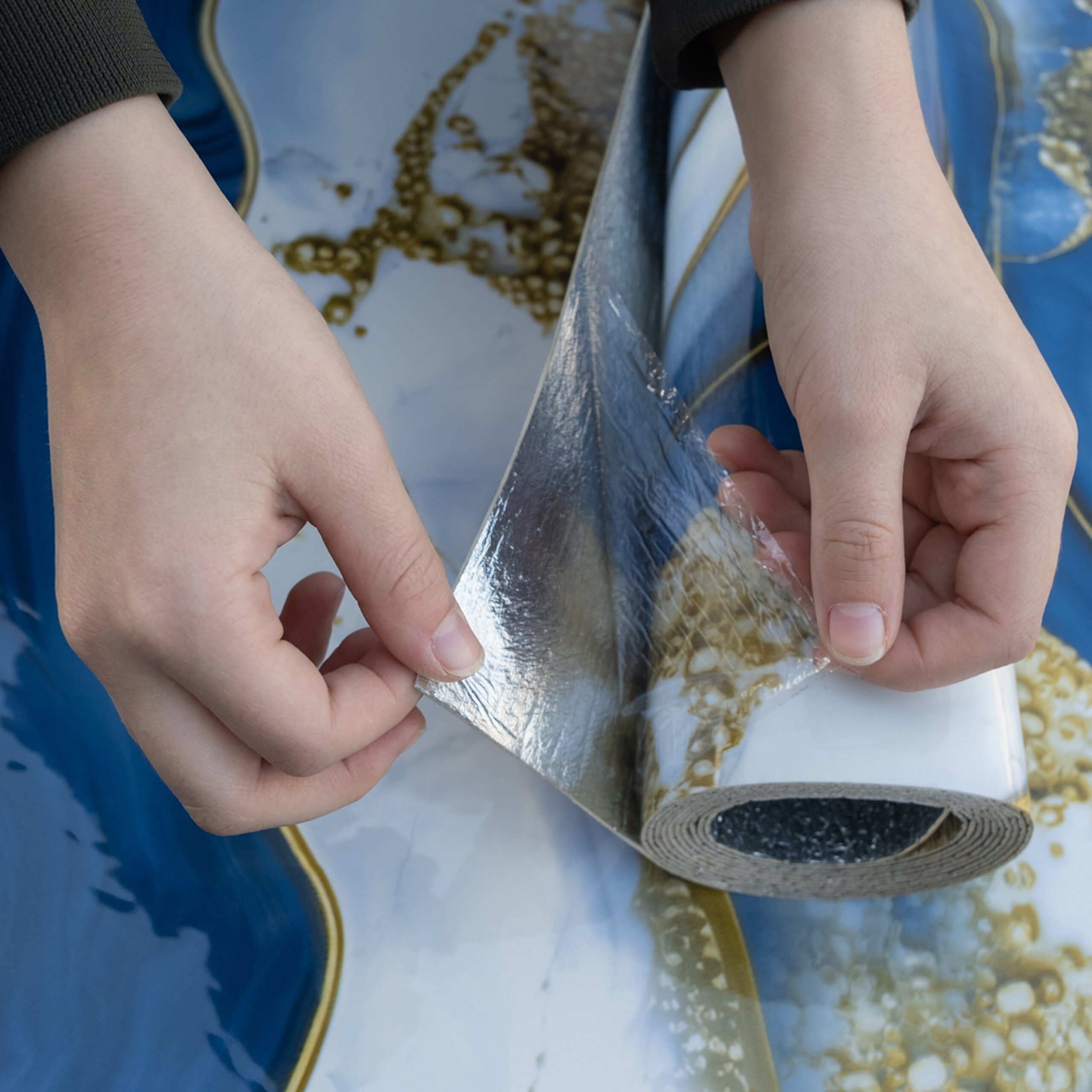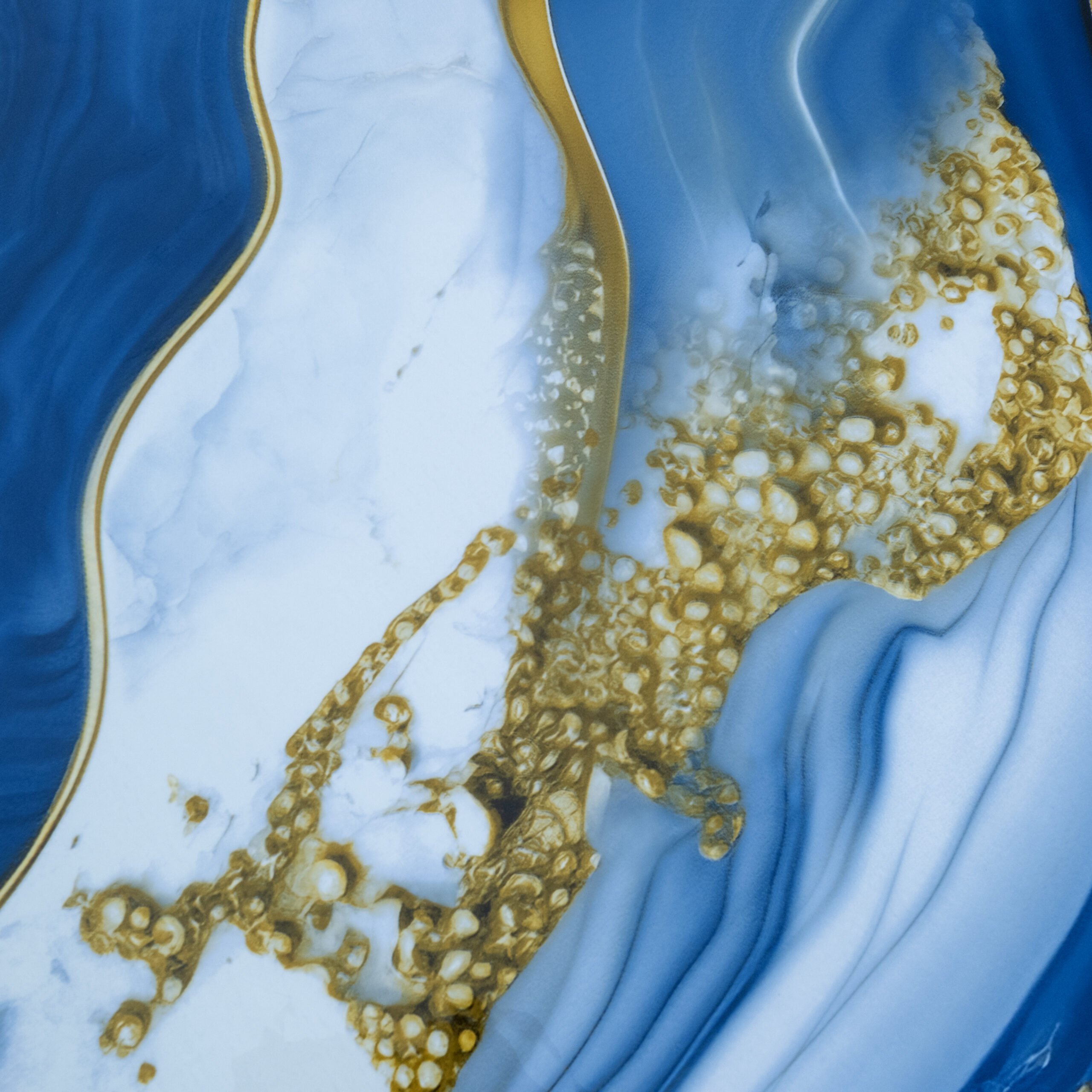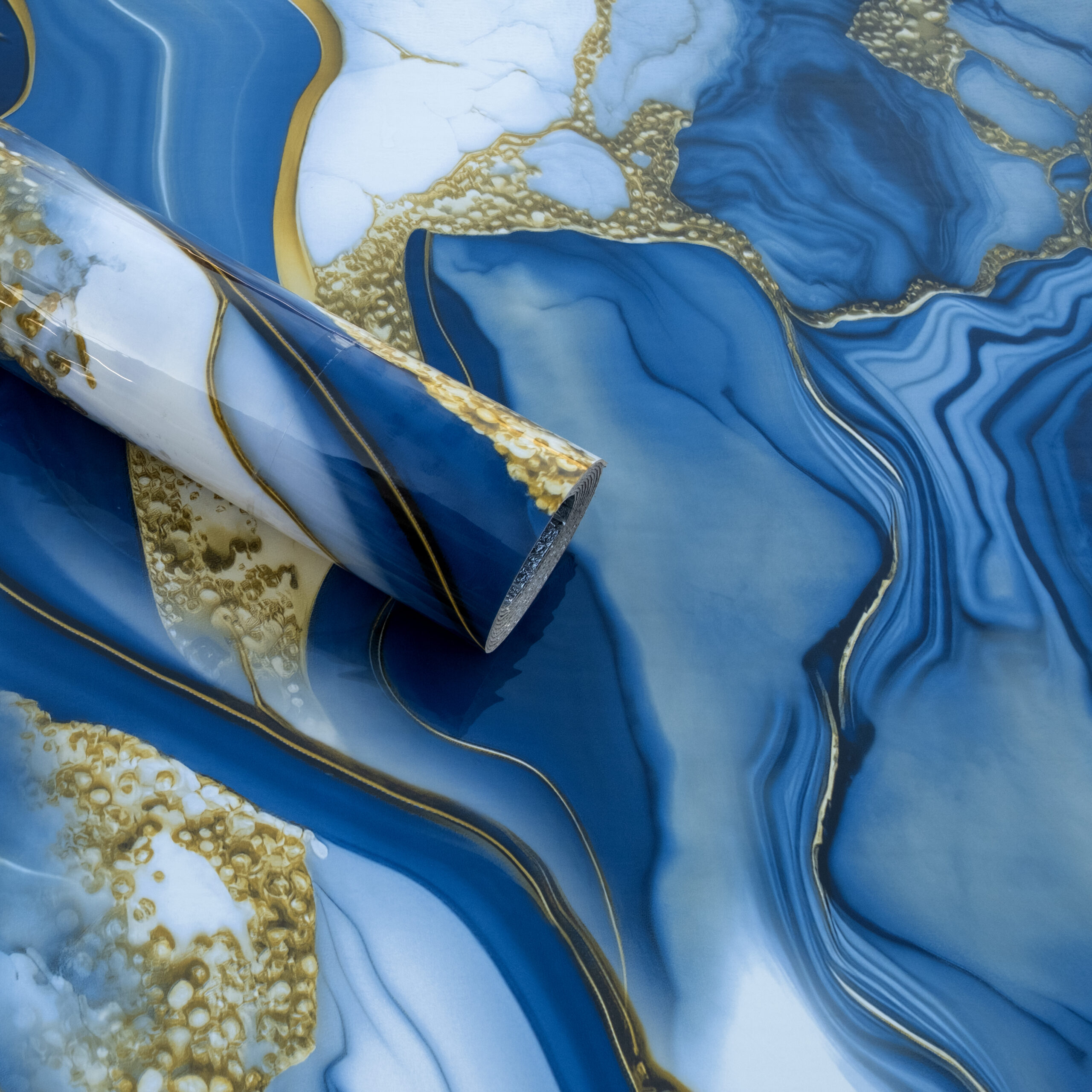 Sky Blue with White Golden Marble Design Self Adhesive UV Marble Foam Sheet 10X4 Waves Pattern